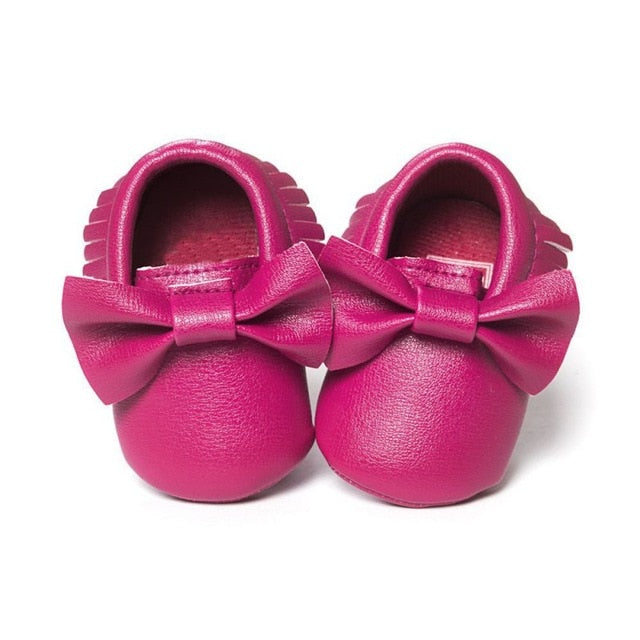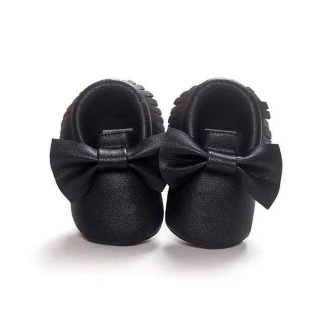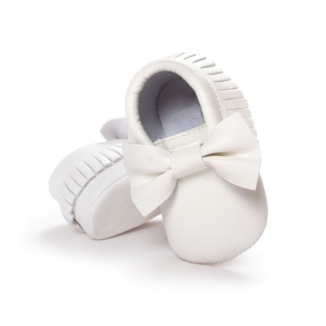 Your little girl will surely look amazingly sweet with our Bow Tie Moccasin slip-on. Complete with its soft, comfy soles and side fringe.